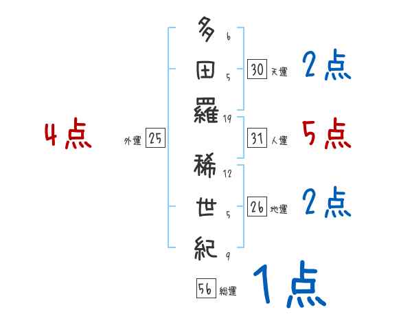 天運![]() | 多田羅稀世紀さんの天運は30画の2つ星!浮き沈みの激しさに注意しましょう。 家系が持つ宿命的な運勢を表します。祖先から受け継いだ苗字ですので自分の力が及びません。家柄を象徴します。 |
