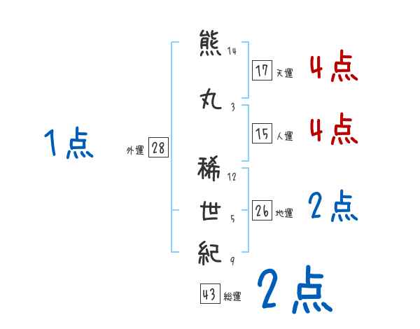 天運![]() | 熊丸稀世紀さんの天運は17画の4つ星!積極的な行動力。地位を気づき財産を手に入れる。純粋な心と直感力。 家系が持つ宿命的な運勢を表します。祖先から受け継いだ苗字ですので自分の力が及びません。家柄を象徴します。 |