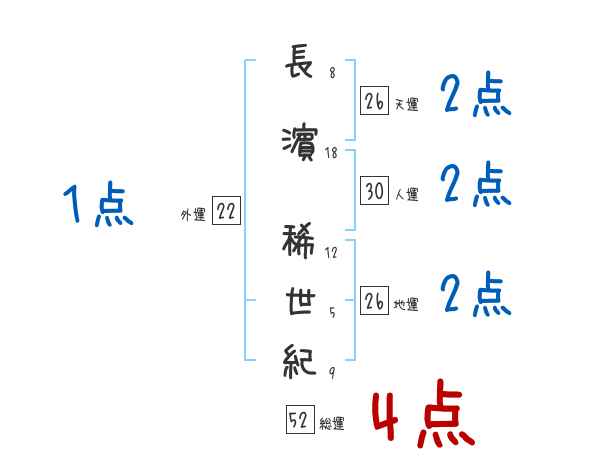 地運![]() | 長濵稀世紀さんの地運は26画の2つ星!波瀾万丈かも。信頼できる人を大事にしましょう。 個性を表す基礎的な運勢です。性格形成や対人関係、行動力など家庭環境に影響されます。主に誕生してから20歳くらいまでの若年期の運勢を表します。 |