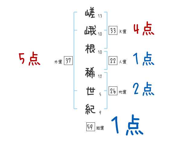 人運![]() | 嵯峨根稀世紀さんの人運は22画の1つ星!努力することが苦手ないっぽう手先が器用。芸術性にも優れる。 性格や才能などを表す2番目に重要な運勢です。人間関係や協調性、社会的な成功に影響します。主に20歳から50歳ぐらいまでの中年期の運勢を表します。 |