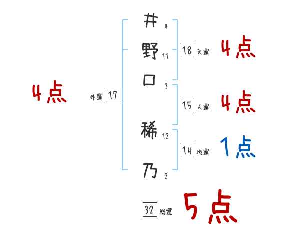 総運![]() | 井野口稀乃さんの総運は32画の5つ星!柔軟性があり成功する。チャンスが多く金運が良い。 あなたの人生を表す1番重要な運勢です。生涯を通じて影響する総合運となり、主に50歳以降の晩年期に影響を及ぼします。 |
