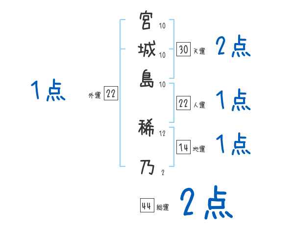 天運![]() | 宮城島稀乃さんの天運は30画の2つ星!浮き沈みの激しさに注意しましょう。 家系が持つ宿命的な運勢を表します。祖先から受け継いだ苗字ですので自分の力が及びません。家柄を象徴します。 |