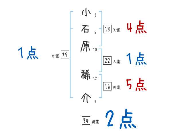 総運![]() | 小石原稀介さんの総運は34画の2つ星!独創性に優れるが、自尊心が強く災難に注意しましょう。 あなたの人生を表す1番重要な運勢です。生涯を通じて影響する総合運となり、主に50歳以降の晩年期に影響を及ぼします。 |