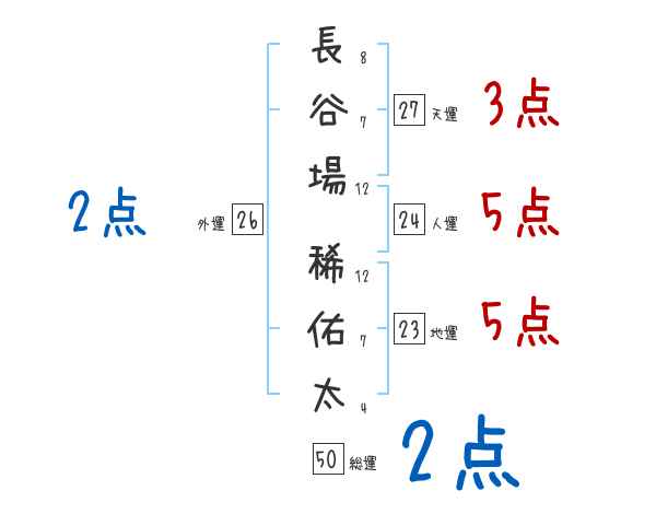 天運![]() | 長谷場稀佑太さんの天運は27画の3つ星!頭脳明晰だが強情で摩擦が多い傾向。孤立に注意。 家系が持つ宿命的な運勢を表します。祖先から受け継いだ苗字ですので自分の力が及びません。家柄を象徴します。 |