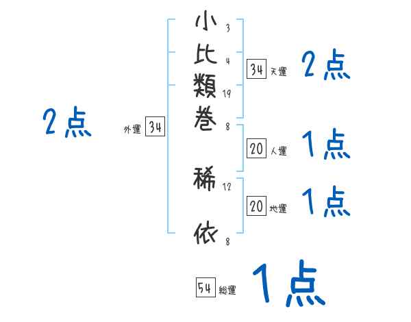 外運![]() | 小比類巻稀依さんの外運は34画の2つ星!独創性に優れるが、自尊心が強く災難に注意しましょう。 生活面を象徴する運勢です。外部から受ける影響力を表し、結婚運、家庭運や職場、環境への順応性を表します。 |