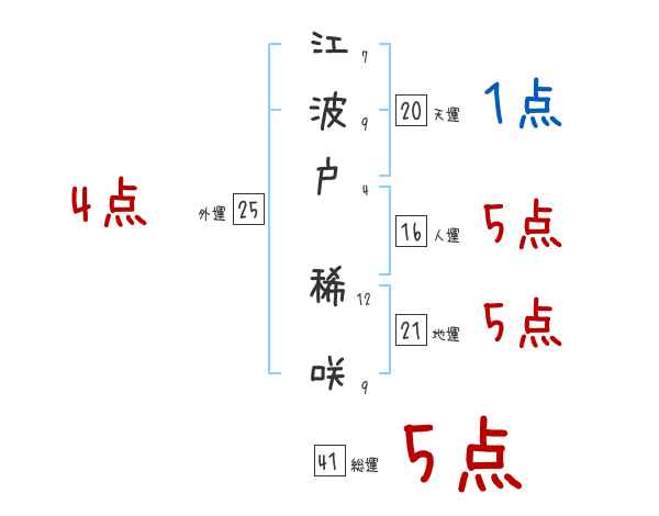 人運![]() | 江波戸稀咲さんの人運は16画の5つ星!人望が厚く大きく発展する。逆転成功が見える。 性格や才能などを表す2番目に重要な運勢です。人間関係や協調性、社会的な成功に影響します。主に20歳から50歳ぐらいまでの中年期の運勢を表します。 |