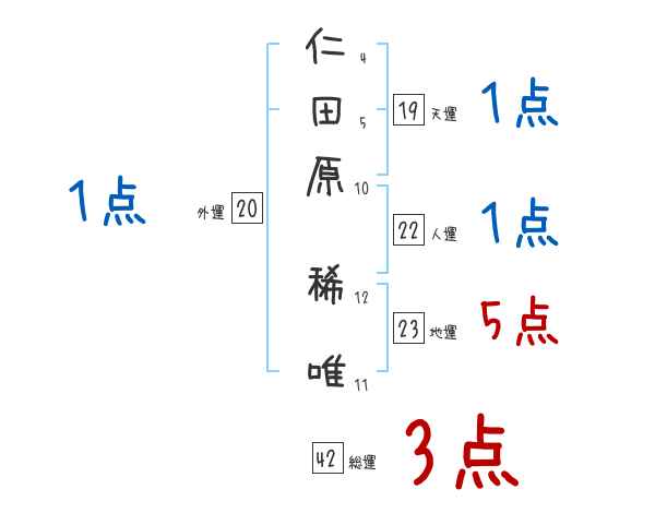 総運![]() | 仁田原稀唯さんの総運は42画の3つ星!病気に注意。多芸であるが消極的でおとなしい。 あなたの人生を表す1番重要な運勢です。生涯を通じて影響する総合運となり、主に50歳以降の晩年期に影響を及ぼします。 |