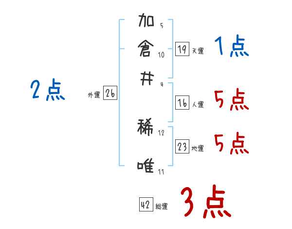 人運![]() | 加倉井稀唯さんの人運は16画の5つ星!人望が厚く大きく発展する。逆転成功が見える。 性格や才能などを表す2番目に重要な運勢です。人間関係や協調性、社会的な成功に影響します。主に20歳から50歳ぐらいまでの中年期の運勢を表します。 |