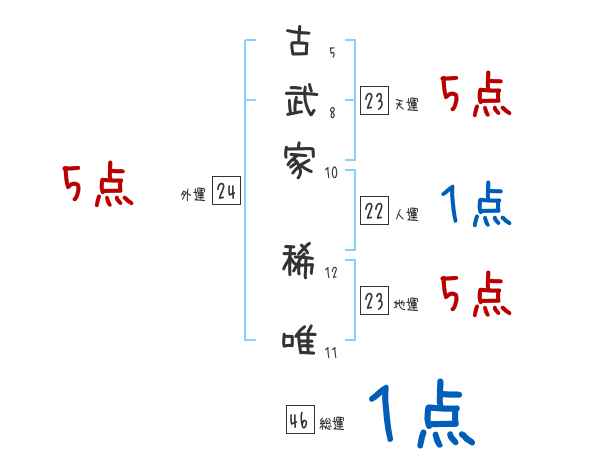 天運![]() | 古武家稀唯さんの天運は23画の5つ星!想像力に優れ活力がある。一代で成功し名誉を手に入れる。 家系が持つ宿命的な運勢を表します。祖先から受け継いだ苗字ですので自分の力が及びません。家柄を象徴します。 |