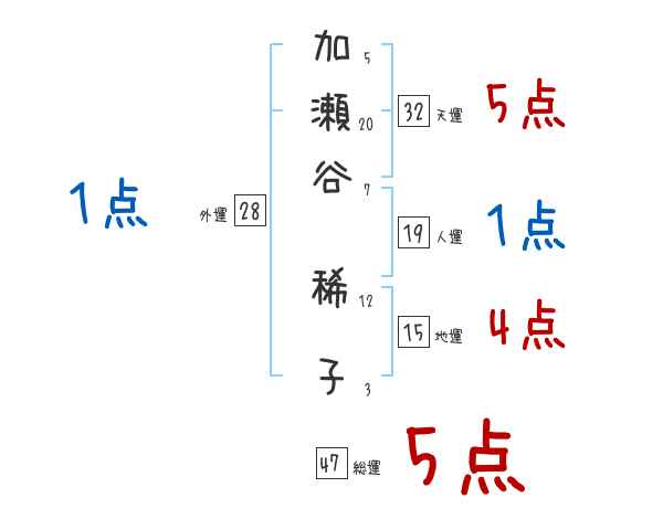 外運![]() | 加瀬谷稀子さんの外運は28画の1つ星!家庭環境に注意。スポーツで活躍できる能力があるかも。 生活面を象徴する運勢です。外部から受ける影響力を表し、結婚運、家庭運や職場、環境への順応性を表します。 |