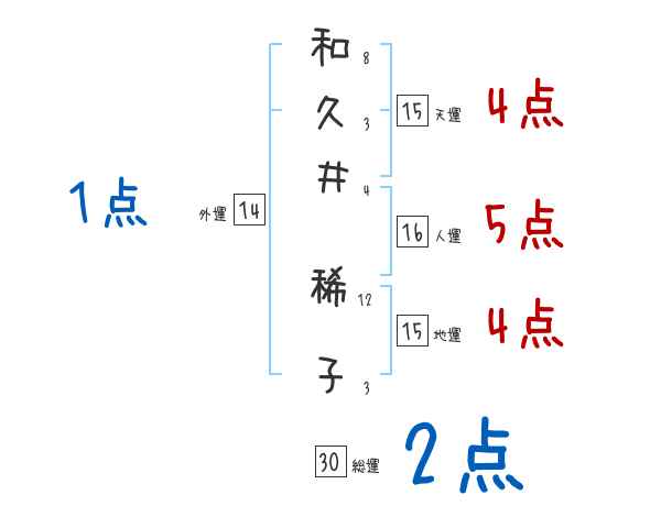 外運![]() | 和久井稀子さんの外運は14画の1つ星!人に対して優しいがストレスを溜め込みがち。人間関係のトラブルを避けるよう気をつけましょう。 生活面を象徴する運勢です。外部から受ける影響力を表し、結婚運、家庭運や職場、環境への順応性を表します。 |