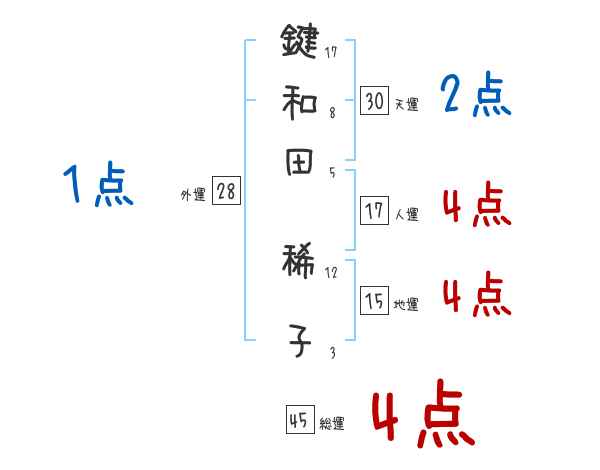 外運![]() | 鍵和田稀子さんの外運は28画の1つ星!家庭環境に注意。スポーツで活躍できる能力があるかも。 生活面を象徴する運勢です。外部から受ける影響力を表し、結婚運、家庭運や職場、環境への順応性を表します。 |