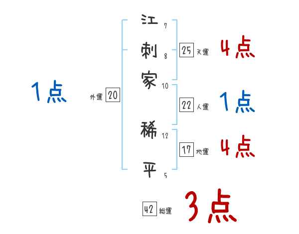 天運![]() | 江刺家稀平さんの天運は25画の4つ星!個性があり才能があふれる。強運の持ち主で発展する。 家系が持つ宿命的な運勢を表します。祖先から受け継いだ苗字ですので自分の力が及びません。家柄を象徴します。 |