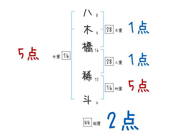 総運![]() | 八木橋稀斗さんの総運は44画の2つ星!誠実で慎重な性格。物事を考えすぎないように注意しましょう。 あなたの人生を表す1番重要な運勢です。生涯を通じて影響する総合運となり、主に50歳以降の晩年期に影響を及ぼします。 |