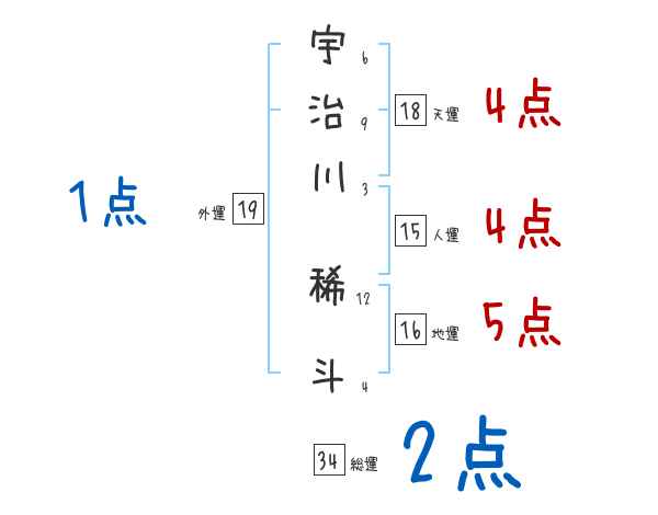 総運![]() | 宇治川稀斗さんの総運は34画の2つ星!独創性に優れるが、自尊心が強く災難に注意しましょう。 あなたの人生を表す1番重要な運勢です。生涯を通じて影響する総合運となり、主に50歳以降の晩年期に影響を及ぼします。 |