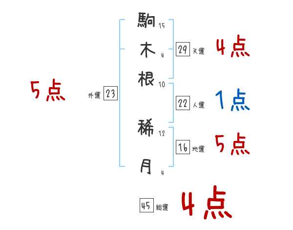 総運![]() | 駒木根稀月さんの総運は45画の4つ星!もくもくと物事を進め達成する。地味な努力家。 あなたの人生を表す1番重要な運勢です。生涯を通じて影響する総合運となり、主に50歳以降の晩年期に影響を及ぼします。 |