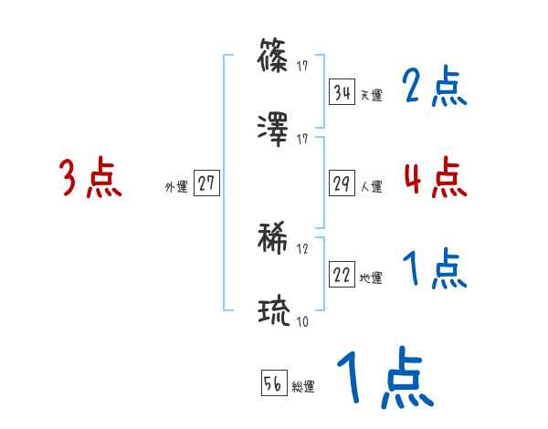 天運![]() | 篠澤稀琉さんの天運は34画の2つ星!独創性に優れるが、自尊心が強く災難に注意しましょう。 家系が持つ宿命的な運勢を表します。祖先から受け継いだ苗字ですので自分の力が及びません。家柄を象徴します。 |