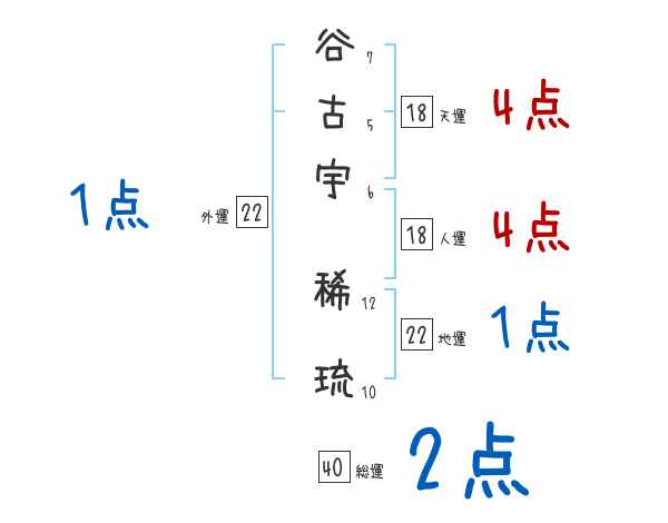 地運![]() | 谷古宇稀琉さんの地運は22画の1つ星!努力することが苦手ないっぽう手先が器用。芸術性にも優れる。 個性を表す基礎的な運勢です。性格形成や対人関係、行動力など家庭環境に影響されます。主に誕生してから20歳くらいまでの若年期の運勢を表します。 |