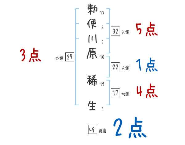 天運![]() | 勅使川原稀生さんの天運は32画の5つ星!柔軟性があり成功する。チャンスが多く金運が良い。 家系が持つ宿命的な運勢を表します。祖先から受け継いだ苗字ですので自分の力が及びません。家柄を象徴します。 |