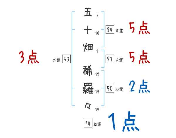 外運![]() | 五十畑稀羅々さんの外運は53画の3つ星!やや見栄っ張りで虚栄心がある。散財に注意。 生活面を象徴する運勢です。外部から受ける影響力を表し、結婚運、家庭運や職場、環境への順応性を表します。 |