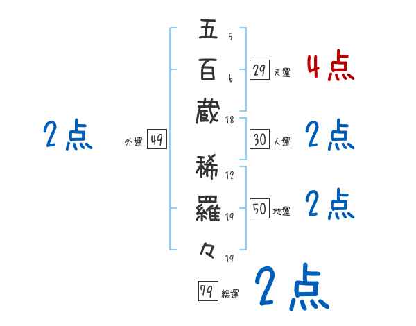 総運![]() | 五百蔵稀羅々さんの総運は79画の2つ星!消極的な性格で不振に終わることが多い。不安定にならないように気をつけましょう。 あなたの人生を表す1番重要な運勢です。生涯を通じて影響する総合運となり、主に50歳以降の晩年期に影響を及ぼします。 |