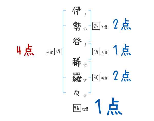 総運![]() | 伊勢谷稀羅々さんの総運は76画の1つ星!離散に注意。劣等感を感じ孤立しやすい傾向があるかも。 あなたの人生を表す1番重要な運勢です。生涯を通じて影響する総合運となり、主に50歳以降の晩年期に影響を及ぼします。 |