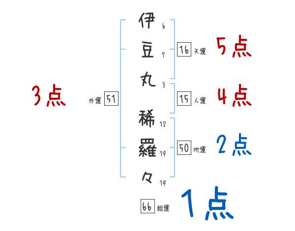 外運![]() | 伊豆丸稀羅々さんの外運は51画の3つ星!変化が激しく、危険に注意。堅実な性格。 生活面を象徴する運勢です。外部から受ける影響力を表し、結婚運、家庭運や職場、環境への順応性を表します。 |