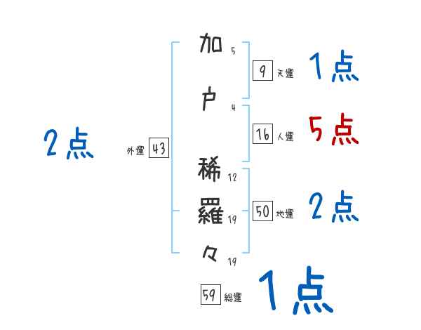 天運![]() | 加戸稀羅々さんの天運は9画の1つ星!消極的で才能を発揮することが苦手なことも。周りの意見に耳を傾けましょう。 家系が持つ宿命的な運勢を表します。祖先から受け継いだ苗字ですので自分の力が及びません。家柄を象徴します。 |