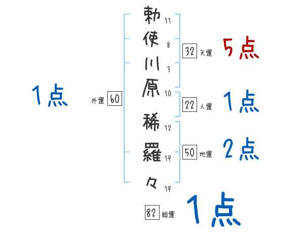 天運![]() | 勅使川原稀羅々さんの天運は32画の5つ星!柔軟性があり成功する。チャンスが多く金運が良い。 家系が持つ宿命的な運勢を表します。祖先から受け継いだ苗字ですので自分の力が及びません。家柄を象徴します。 |