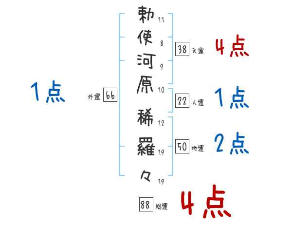 天運![]() | 勅使河原稀羅々さんの天運は38画の4つ星!温厚な性格で技術的な才能を発揮する。職人的な仕事に向いている。 家系が持つ宿命的な運勢を表します。祖先から受け継いだ苗字ですので自分の力が及びません。家柄を象徴します。 |