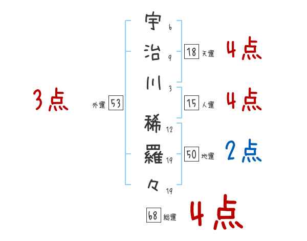 天運![]() | 宇治川稀羅々さんの天運は18画の4つ星!情熱的で剛気。忍耐力があり信頼される。 家系が持つ宿命的な運勢を表します。祖先から受け継いだ苗字ですので自分の力が及びません。家柄を象徴します。 |