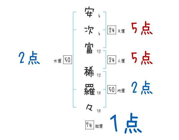 天運![]() | 安次富稀羅々さんの天運は24画の5つ星!家庭運が良く順調な人生。金運にも恵まれる。 家系が持つ宿命的な運勢を表します。祖先から受け継いだ苗字ですので自分の力が及びません。家柄を象徴します。 |