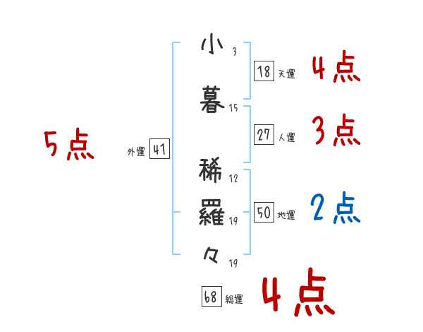 天運![]() | 小暮稀羅々さんの天運は18画の4つ星!情熱的で剛気。忍耐力があり信頼される。 家系が持つ宿命的な運勢を表します。祖先から受け継いだ苗字ですので自分の力が及びません。家柄を象徴します。 |
