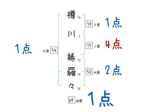 天運![]() | 樽川稀羅々さんの天運は19画の1つ星!優れた才能を持ちますが、協調性が足りないことも。周りの人と協力する事を意識しましょう。 家系が持つ宿命的な運勢を表します。祖先から受け継いだ苗字ですので自分の力が及びません。家柄を象徴します。 |