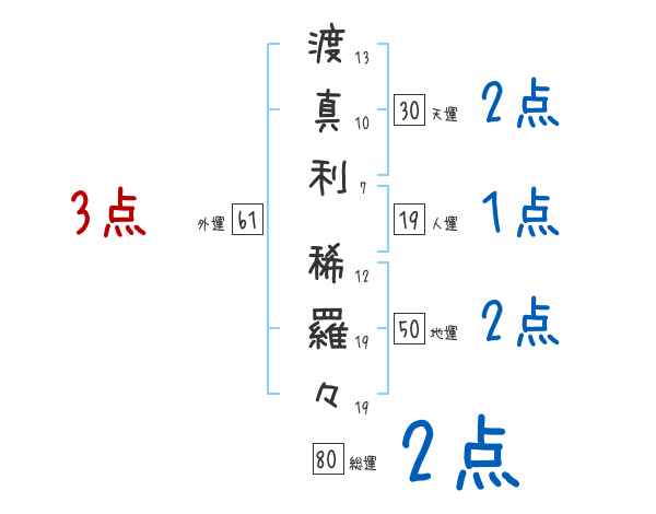 天運![]() | 渡真利稀羅々さんの天運は30画の2つ星!浮き沈みの激しさに注意しましょう。 家系が持つ宿命的な運勢を表します。祖先から受け継いだ苗字ですので自分の力が及びません。家柄を象徴します。 |