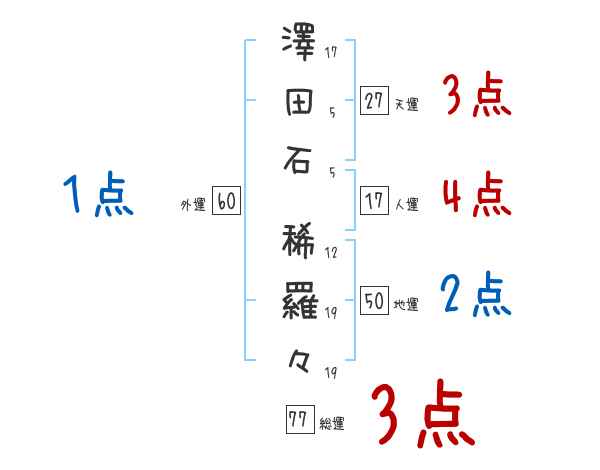 外運![]() | 澤田石稀羅々さんの外運は60画の1つ星!悲観的で迷いやすい。波乱が多く損をしないように。 生活面を象徴する運勢です。外部から受ける影響力を表し、結婚運、家庭運や職場、環境への順応性を表します。 |