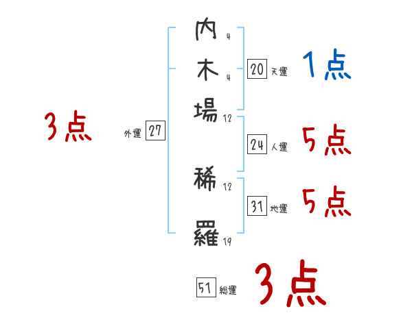 外運![]() | 内木場稀羅さんの外運は27画の3つ星!頭脳明晰だが強情で摩擦が多い傾向。孤立に注意。 生活面を象徴する運勢です。外部から受ける影響力を表し、結婚運、家庭運や職場、環境への順応性を表します。 |