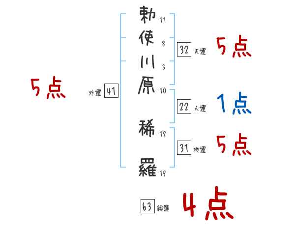 天運![]() | 勅使川原稀羅さんの天運は32画の5つ星!柔軟性があり成功する。チャンスが多く金運が良い。 家系が持つ宿命的な運勢を表します。祖先から受け継いだ苗字ですので自分の力が及びません。家柄を象徴します。 |