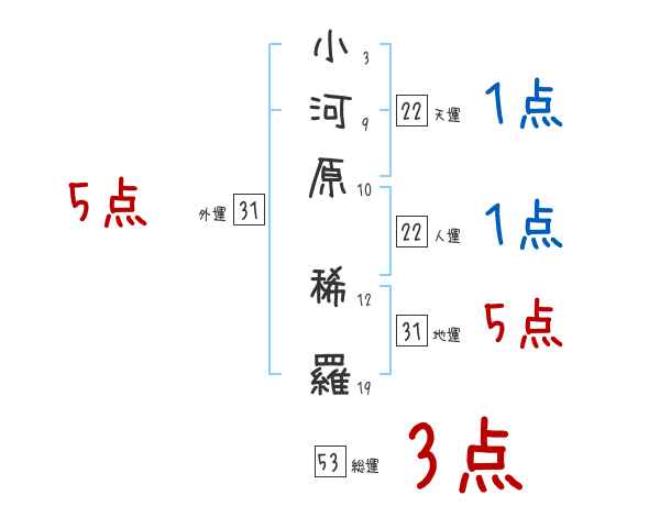 総運![]() | 小河原稀羅さんの総運は53画の3つ星!やや見栄っ張りで虚栄心がある。散財に注意。 あなたの人生を表す1番重要な運勢です。生涯を通じて影響する総合運となり、主に50歳以降の晩年期に影響を及ぼします。 |