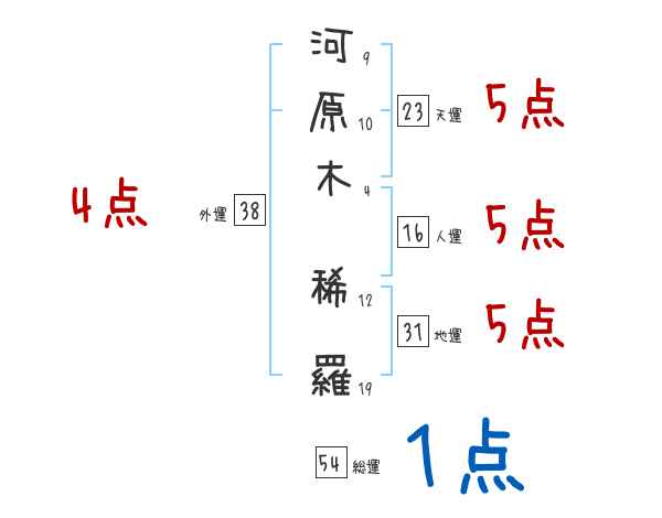 人運![]() | 河原木稀羅さんの人運は16画の5つ星!人望が厚く大きく発展する。逆転成功が見える。 性格や才能などを表す2番目に重要な運勢です。人間関係や協調性、社会的な成功に影響します。主に20歳から50歳ぐらいまでの中年期の運勢を表します。 |