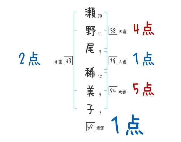 外運![]() | 瀬野尾稀美子さんの外運は43画の2つ星!頑固な性格で独立心が強いかも。やや非現実的で浪費に注意しましょう。 生活面を象徴する運勢です。外部から受ける影響力を表し、結婚運、家庭運や職場、環境への順応性を表します。 |