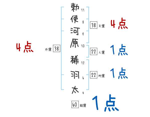 天運![]() | 勅使河原稀羽太さんの天運は38画の4つ星!温厚な性格で技術的な才能を発揮する。職人的な仕事に向いている。 家系が持つ宿命的な運勢を表します。祖先から受け継いだ苗字ですので自分の力が及びません。家柄を象徴します。 |
