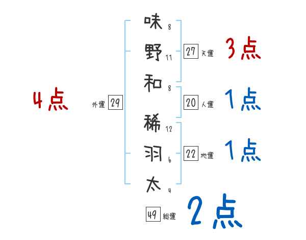 総運![]() | 味野和稀羽太さんの総運は49画の2つ星!不安定な性格で明暗がある人生。周りの人には支援されやすい。 あなたの人生を表す1番重要な運勢です。生涯を通じて影響する総合運となり、主に50歳以降の晩年期に影響を及ぼします。 |