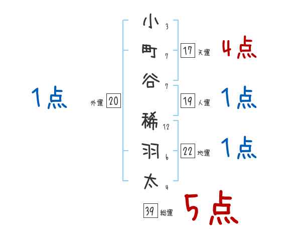 天運![]() | 小町谷稀羽太さんの天運は17画の4つ星!積極的な行動力。地位を気づき財産を手に入れる。純粋な心と直感力。 家系が持つ宿命的な運勢を表します。祖先から受け継いだ苗字ですので自分の力が及びません。家柄を象徴します。 |