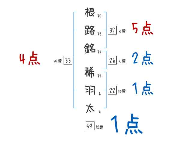 総運![]() | 根路銘稀羽太さんの総運は59画の1つ星!意志の弱さであきらめることが多いかも。粘り強さが必要。 あなたの人生を表す1番重要な運勢です。生涯を通じて影響する総合運となり、主に50歳以降の晩年期に影響を及ぼします。 |
