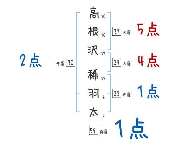 総運![]() | 高根沢稀羽太さんの総運は59画の1つ星!意志の弱さであきらめることが多いかも。粘り強さが必要。 あなたの人生を表す1番重要な運勢です。生涯を通じて影響する総合運となり、主に50歳以降の晩年期に影響を及ぼします。 |