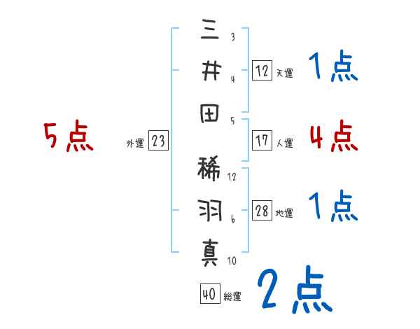 外運![]() | 三井田稀羽真さんの外運は23画の5つ星!想像力に優れ活力がある。一代で成功し名誉を手に入れる。 生活面を象徴する運勢です。外部から受ける影響力を表し、結婚運、家庭運や職場、環境への順応性を表します。 |