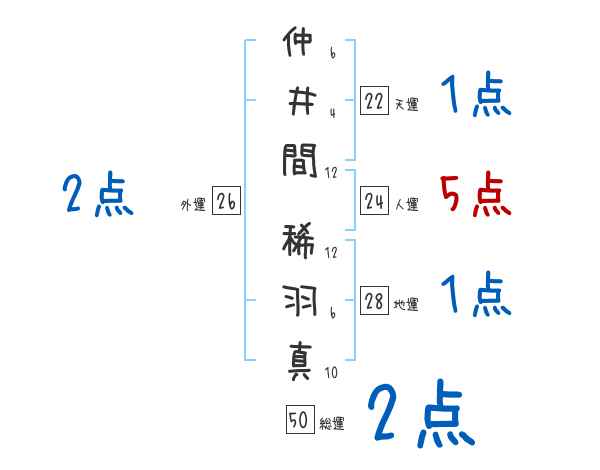 人運![]() | 仲井間稀羽真さんの人運は24画の5つ星!家庭運が良く順調な人生。金運にも恵まれる。 性格や才能などを表す2番目に重要な運勢です。人間関係や協調性、社会的な成功に影響します。主に20歳から50歳ぐらいまでの中年期の運勢を表します。 |