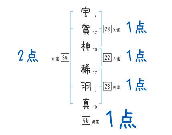 宇賀神稀羽真さんの画数の鑑定結果