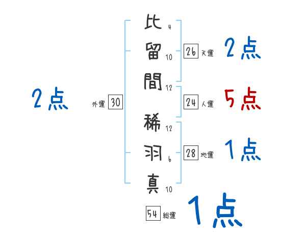 天運![]() | 比留間稀羽真さんの天運は26画の2つ星!波瀾万丈かも。信頼できる人を大事にしましょう。 家系が持つ宿命的な運勢を表します。祖先から受け継いだ苗字ですので自分の力が及びません。家柄を象徴します。 |